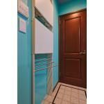 明るいホテルライクな洗面所になるよう、ブルーグリーンの壁紙をご提案。洗面台も収納力のあるものをご提案しました。