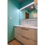 鮮やかなブルーグリーンの壁と大容量の洗面台で、明るく開放的な洗面空間へリフォーム。毎日の身支度が気持ちよくできる使いやすい空間に生まれ変わりました。