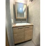 洗面は木の質感やぬくもりを感じる、木目調のデザイン。 キャビネットは抜群の収納スペースを誇り、大きなものも余裕で収まります。