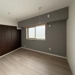 腰窓側のやさしいグレーのアクセントクロスが、空間に落ち着いた雰囲気を与え、クローゼット扉や白い壁、ウォールナットの床と自然に調和し、明るくやわらかさを感じられるスタイリッシュな洋室に仕上がりました。