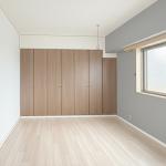 壁と天井は白いクロスで明るく、クローゼット扉は床のフローリングと調和したベージュの木目で統一され、落ち着いた雰囲気を持つ空間でした。