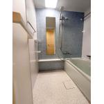 正面の収納を無くし、スリムカウンタータイプにしました。 壁側面には収納棚を設置し、収納力はそのまま、スッキリとした印象になりました。 浴槽は、肩回りがゆったりとした入浴感が体感できるラウンド浴槽を選びました。入浴の心地よさだけでなく高い節水効果も期待できます!