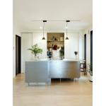 CUBE型のキッチンを配置するにあたり、四方から作業できるようレイアウトを工夫をしました。 キッチン本体は珍しい形で、動線がほぼなく手の届く範囲で作業ができるため忙しい時間も効率的に。 食洗器はガゲナウのフロントオープンタイプ、サイドに配置されています。大容量で片付けも楽々。 IHを採用することでレンジフードもなくし、見た目もすっきりとした印象です。 また、背面収納は家電などが全て隠れるように扉をつけました。 中に収納する物と扉が干渉し使い勝手が悪くならないよう、細かい寸法を出し入念に計画しました。 一目惚れしたキッチンが生活の中に溶けこみ、使うたびに愛着が湧いていく素敵なリフォームになりました。