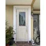 既存の玄関ドアを扉のみ交換。扉のデザインは、以前と似たものをご選定、お色は茶系からアイボリー系に変更されました。ドア枠部分にも白いシートを貼り新しい扉の色に合わせたことで、全体が明るくやさしい印象になりました。お客様には、満足のいくリフォームでしたとのお声を頂戴いたしました。