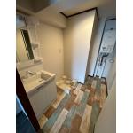 ミラーキャビネットとアクセントクロスでお洒落な洗面に