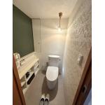節水型トイレへ交換 内装はヨーロピアンテイストをテーマに、一面を落ち着いたグリーンのアクセントクロス、その他三面は白地にダマスク柄が浮かび上がる上品なデザインに。 天井から吊り下げたペンダントライトが柔らかな光を灯し、空間全体を優しく包み込んでいます。 写真で見ると、グリーンとホワイトのコントラスト、照明の陰影が織りなす空気感がとても上品で、落ち着いた高級感のある仕上がりとなりました。