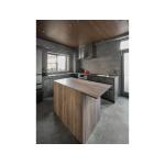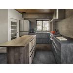 設計・施工では、L型キッチンと勝手口の取り合いを現場で調整し、大判タイルや漆喰壁、天井の納まりにも工夫を凝らしました。キッチンカウンター側は昼白色、部屋全体は電球色の照明で、濃いグレーのタイルでも手元が暗くならないよう配慮しました。床はモルタル調フロアタイルで清掃性も向上。お施主さまからは、シンクとコンロの距離が近く作業しやすく、アイランド作業台も便利で、収納も使いやすくなり、理想の美しいキッチンに大満足との声をいただきました。