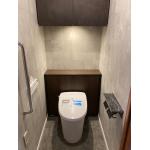 水まわり全体のデザインを統一するため、トイレにも上質で落ち着きのあるグレー系デザインを採用。 収納一体型のトイレに変更し、背面キャビネットと吊戸棚でスッキリとした印象に仕上げました。 間接照明がやさしく照らし、ホテルのような高級感を演出しています。