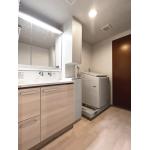 クリナップのエスをご提案しました。 洗面ボウル中に段差があり、濡れたものを気軽に置いておけるスペースに。 また、キャビネットと収納の底板はステンレス仕様のため湿気に強く、じめじめした脱衣所に最適です。 既存と類似した収納付きカウンターは、既製品では同じような商品がなかったため、 サイドキャビネット、集成カウンター、背面のパネルを組み合わせてご提案しました。 下台のキャビネットには蹴込み部がなかったため造作しました。 内装は明るく、ベージュのクロスやクッションフロアを採用。 洗面の扉とよく調和し、落ち着いた雰囲気に仕上がりました。