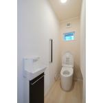 数社検討の結果、トイレはTOTOのGG3。手摺・手洗器は当初ご提案のコフレル、木手摺を壁紙に合わせ色決めいただきました。またトイレ隣の階段下スペースを活用し、トイレ内収納スペースを設けました。