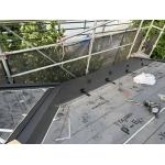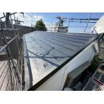 新しく施工した金属屋根が確認でき、重ね葺きによる継ぎ目の整った仕上がりや、防水性を高める役物の納まりがしっかりと施されている様子が分かります。