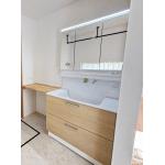 家事カウンターを隣接した化粧台やランドリースペースと一体的に配置したことで作業効率アップ。 三面鏡と2段収納キャビネットで収納力もアップしました。