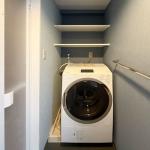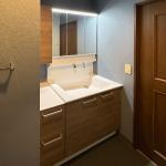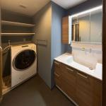 吊戸棚や壁の埋め込み収納をなくし、三面鏡裏の収納を活用することで、洗面まわりがぐっとすっきりとした印象になりました。洗濯機上には便利な棚を新設し、使い勝手と収納力を両立したスマートな空間に仕上がっています。