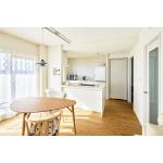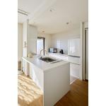 アイランドキッチンにしたいとのご要望でしたが、マンションで移動できないパイプスペースやインターホン等があったためにペニンシュラ型をご提案しました。 少し古く感じる内装も一新して、華美な色あいではなく白を基調とした明るくシンプルな内装で、飽きのこない空間づくりを目指しました。