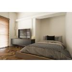 TVボード下には間接照明を仕込みました。 ベッドスペースは床の高さを少し上げて落ち着いた雰囲気に。