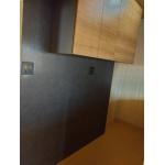 施工後 リビングと繋がるカウンターに雪見月見障子を設置いたしました。黒と木目を基調とした高級感のあるキッチンに仕上がりました。