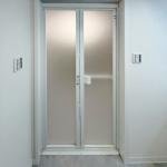浴室入口の段差を解消し、出入りしやすい折れ戸(幅700mm/ホワイト)に交換しました。清潔感のある白い扉と段差のない設計により、安全で快適に出入りできる空間に生まれ変わっています。