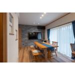 間仕切位置を変更し、キッチン・リビングと繋がる回遊できるダイニングにしました。 スペースを有効に使うため、壁掛けテレビを採用し アクセントの壁にはエコカラットを貼りました。