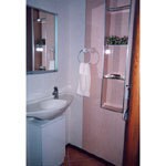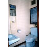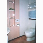 一坪もあるトイレだからこそ出来る事をしようと思い、450mm角のフロアタイルとオリジナルの飾り棚を提案し、気に入っていただきました。 ダブルシェードのカーテンが全体のバランスを良くしました。