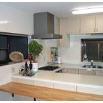 Ⅰ型のキッチンをコの字型キッチンへリフォームしました。お客様の趣味の蕎麦作り用の広々としたカウンターが特長です。お客様をお招きして目の前で蕎麦を打とうという演出を考えたプランです。キッチン右側のキャビネットは食器乾燥機です。食器入れとしても使えますのでキツチンをスッキリと見せることが出来ます。奥の窓は出窓に交換してあります。キッチンは松下電工製で商品価255万です。