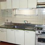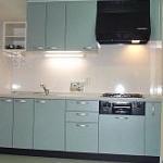 グリーンの扉のキッチンです。 松下電工のシステムキツチンです。間口230cmのシンブルで使いやすいキッチンだと思います。ここまでなら普通のキッチンですが・・・。 ワインラックとグラスホルダーを取付けました。この部分は特注ですのでご希望に合わせて作ります。