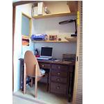 ミニ書斎 ご予算 約40万円 押入れに造った書斎です。畳一枚もないスペースですがインターネットに接続されたパソコン、電話があり機能的な空間になっています。 和室の押入れの半分を書斎にしました。机の前には電話、TVコンセントを取付け、机の上にはプリンターがのる棚を作りました。 左側の窓の向こうはリビングです。 雑誌 男の隠れ家 2003年10月号 書斎特集に紹介されています。