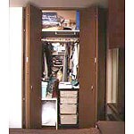 (旧株式会社ダイチでの事例です。)壁を取り払って開放的なLDを創り、収納もたくさん設けたいというのが、お客様のご希望でした。その際、ネックになるのがベットスペースでした。開放感と独立感を両立させるにはどうすればいいか考えた結果。ベットスペースは透かしのある無垢材の工芸調引き戸でLDとの間仕切りし、ワンルームとしての開放感を保ちつつ、個室風の落ち着きを確保。また、ベットスペースには隣室の納戸からも出し入れできるよう素通しになったクローゼットを設け、キッチンカウンター収納にも工夫を凝らしています。