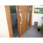 木製の玄関ドアが風雨や日照によって傷んできてしまいました。 玄関周りとの協調も考え、また天候の変化への対応力も高い“木目調”のアルミ製のドアに交換しました。また、欄間を無くし、両袖も変わりました。