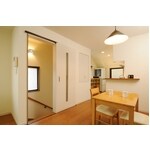 冷房の効率を高めるために階段には引き戸を取りつけました。 また、空いたスペースには収納棚を設置しました。