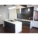 離れにあるダイニングキッチンを改修。 勾配天井にし梁を生かして古民家風にリフォームしました。対面式のキッチンをアイランド型のキッチンに替えました。リビングにはご主人の趣味の読書が楽しめるロフトを設けました。(手摺の模様は大工さんの手彫りです)