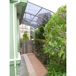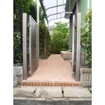 東側と北側が道路に面し、南は公園と好立地に建つお宅です。玄関・駐車場は北側からのアプローチになっており、東側は、ぐるりとフェンスで囲われていました。今までは、駐車場の奥に自転車を引き込んでしまっていましたが、出し入れのしやすい駐輪スペースを作りたいとご要望がありました。そこで、東側に出入り口を設け、お庭を利用するプランをご提案しました。南東のテラス窓前は、少し狭くなっており庭としては活用しづらい空間でしたが、駐輪スペースには丁度よい寸法でした。窓上にテラス屋根を取付け、雨よけに。公園に面しているので、防犯と視線よけに生垣に合わせて、背の高い門扉を取付けています。