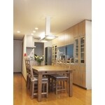 リフォーム前は2階に縦長のLDKで隅にL型のキッチンという間取りでした。 ご家族が多いので洗面と洗濯機を2階に持って行きたいというご要望でしたので、キッチンを対面にして後にカップボードを持ってくることと、その奥に洗面・洗濯スペース兼パントリーの空間を作ることで、大容量の収納スペースを確保できるリフォームをさせていただきました。 ダイニングテーブルの上に付けた換気ライトは、照明と換気の2つの機能を兼ね備えた優れもので、ご家族で焼肉やお鍋をすることが多いお家では大活躍です。デザインも何種類かあり、ちょっとしたお部屋のアクセントにもなります。