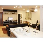 リビングの中心にキッチンを設置し明るく解放感がある空間へ。幅3メートルもあるカップボードは大容量収納ができ、すっきりとしたリビングになりました。ワンちゃんを飼われていたので、フローリングはキズ・汚れが付きにくく、ペットの歩行時の滑りに配慮した表面加工でペットの足や腰への負担を軽減するものを選定しました。