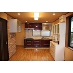 台所と居間の二部屋をLDKの一室にされたいとのご要望があり、照明もダウンライトを入れて落ち着いた雰囲気に仕上がりました。