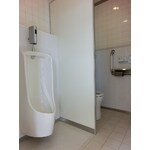 3.1×3.4m四方の空間に、和便が2台と用具庫のブース、小便器が3台と手洗いがありました。間仕切る前は広く見えますが、男女で仕切りその中で更に個室に仕切ると、かぎりあるスペースの有効活用が求められてきます。扉の向きや位置、ブースの配置・壁の角度など、使い勝手に気を付けてプランしました。また、電気の容量にも制限があったため、一度に複数の使用を想定すると、消費電力の小さい器具を選ぶなどの注意も必要となりました。白を基調に清潔感のある空間になりました。