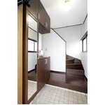 玄関ドアと玄関ホールのリフォーム。内装はリビングの色と合わせました。こちらにも大きな収納を設けました。