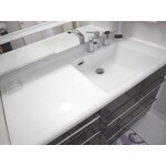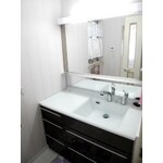 ボウルが小さくて洗いにくくかった洗面化粧台。奥様が一目で気に入ってしまった、透き通ったブルー人工大理石の洗面化粧台クリナップ ティアリスに。大きなボウルと高級感のある一面鏡。引出し収納も充実しています。正面についていた室内照明も天井照明に移動しました。