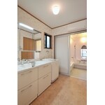 両親とWさん夫妻の4人で使う母屋の洗面所には、それぞれの持ち物を分けて収納できるように引き出しが4つある大型洗面台を設置。お風呂を広くしたいという母親の希望で、農作業に使っている土間の一部を充てて1.25坪のシステムバスを設置。温かみのある色調を用いて、ゆったりとくつろげる空間を演出。