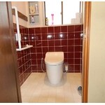 トイレの入り口に10cm以の段差があったので、トイレの床を上げて段差解消。クッションフロアで仕上げました。便器は少しでも空間を広く使えるようにTOTOのタンクレストイレ『ネオレストRH』に替えてスペースを確保しました。調和を考えクッションフロアはホワイトのタイル調をおススメしました。また、ご高齢の方のトイレの立ち座りを楽にするため、L字型手すりを設けました。