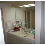 洗面室をかわいらしい雰囲気にしたかった奥様。桜色の面材の洗面台に花柄の壁紙がマッチしています。 機能面では収納量がUPしました。これでもう洗面台の上に物が溜まる心配はありませんね。