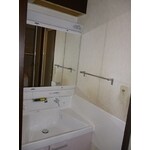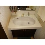 マンション用の特殊サイズからメーカー規格品の洗面化粧台へ変更。周りにキッチンパネルを貼り、水はねによるクロス汚れも解消しました。