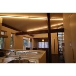 永住というご要望からデザインだけでなくスペック改善も必要だったのでほぼスケルトンにしてすべて断熱工事をやり直した。新築でなく増改築をする事の良さを伝える為に特徴的だった玄関脇の格子窓をそのまま残してそこを建物の軸として、既存外観の曖昧さと室内総建材仕上げの重苦しさを改築で逆転させる計画にした。外観は元々持つ、片流れのシャープな屋根、平屋の地に這うような建物のエッジを再度感じられるように濃い色みと、デッキに明るめの色を使いぼやけないようにバランスを取った。内部は格子窓だけを残して内装が素っ気なくならない為に吹き抜けの高さを活かしたアクセントウォールを地元銘木店に相談して粟・唐松・栃の板を張り分け、区切ラインにメタルを使う事でログハウスの雰囲気にならないようにした。また、照明計画は既存のペンダント中心の計画を変え、壁のアクセントラインがそのまま天井を駆抜けるように設計している。2本のラインはリビングとダイニングの中心へ向かって伸びている。