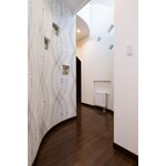 玄関とシューズンクローゼットとの間仕切壁は単純に平面的なRとするのではなく、2Fホールと連続させることで立体感を出すようにご提案した。そこに奥様お気に入りのステンドグラスを設置し、曲面にアクセントをつけた。 シューズインクローゼットはプライベート玄関も兼ねており、収納力と合わせて普段使いでもスッキリと暮らせるようにした。 R壁にすることでできた吹抜けにより、玄関ホールも明るくなり、階段も開放的になった。階段ホールの窓は大開口とはせず、敢えて小さくすることで足立美術館の『生の掛け軸』のような額縁効果を演出し、緑地帯の四季を楽しめるようにした。 工事中に一目惚れして飼ってしまった愛犬のために、設計変更してゲージスペースも造りました。