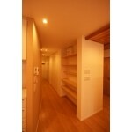 テナントビルのワンフロアをオーナー住居としてコンバーションした事例です。 住居に必要な設備費用は不可欠でしたが、空きテナントの有効活用はお客様のメリットになりました。 事務所ビル特有の立地で大きな開口が設けられており、住空間としてのプライバシーを確保しつつも採光を取れるように透過性のある収納扉をダブルスキンのように配置しています。