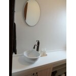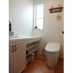 お部屋のスペースを有効に使うために奥行があったカウンターを小さくし、可愛いコンパクトな洗面ボウルをご提案させていただきました。 セミオーダーで造作したカウンターや扉、その他のアクセサリーひとつにしてもこだわってお選びしたので、お客様のイメージ通りに仕上がったと喜んでいただきました。 また、タンクレストイレにすることで、空間に広がりがでて、広々としたカントリー調トイレに仕上がりました。