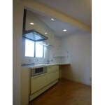 IHクッキングヒーター、電動昇降吊戸など最新機器を取入れました。壁面が変形となっており、間口180cmのコンパクトキッチンと、タイル張りのカウンターを一体で造作しました。家電品をまとめて置け、家事動線の良いスッキリしたキッチンスペースとなりました。