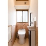 床・腰壁に羽目板を使用。節水型のタンクレス便器とコンパクトな手洗いを設置しエコロジーにも配慮。床材をタイルから無垢材に変えたことで床のひんやり感も解消。