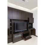 リビングを広くしたいとの要望があったものの、増築すると擁壁が迫り光が入りずらくなるので、天窓をつけ、昼間は間接照明のように光が差し込むようにしました。オリジナルの造作棚はTVはもちろんPCやプリンタもすっきり収納できるものに仕上げました。