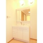【after1】 新しく間取り変更した洗面室兼脱衣室です。 洗面室の中にトイレの個室を設けました。 洗面台向かって右手にトイレがあります。 左手のドアはホール・廊下に続きます。