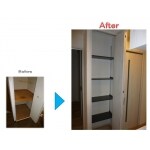 (パナソニック ホームエンジニアリング株式会社での事例です。) 和室をなくしてリビングを広くし、残りのスペースをウォークインクローゼットにし、洋室にもそれぞれ壁一面のクローゼットを造りました。ダイニングに光が届くようになったので、キッチンを移動させ、カウンターも設置。ダウンライトを配し、より一層明るくしました。キッチン移動により、空いたスペースをシューズクロークにし、玄関→リビングと、玄関→シューズクローク→キッチンの2WAY動線を実現しました。(工期:35日)